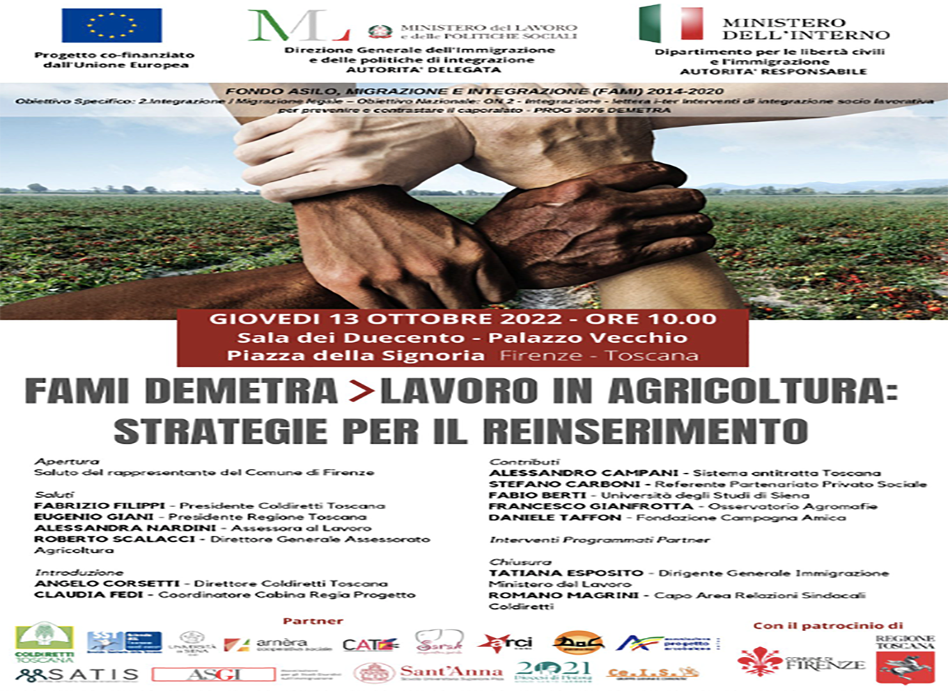 domani, giovedi’ 13 ottobre alle ore 10.00, nella sala dei duecento di palazzo vecchio, sara’ presentato demetra, il progetto che ha come obiettivo quello di contrastare il verificarsi di condizioni che inducono allo sfruttamento in agricoltura e promuovere condizioni di regolarita’ lavorativa in toscana. il progetto e’ coordinato dalla coldiretti regionale, capofila di un ampio partenariato composto da numerose associazioni. interverranno fabrizio FILIPPI (presidente coldiretti toscana), eugenio GIANI (presidente regione toscana), alessandra NARDINI (assessora al lavoro), roberto SCALACCI (direttore generale assessorato agricoltura), alessandro CAMPANI (sistema antitratta toscana), stefano CARBONI (referente partenariato privato sociale), fabio BERTI (universita’ degli studi di siena), francesco GIANFROTTA (osservatorio agromafie) daniele TAFFON (fondazione campagna amica), tatiana ESPOSITO (dirigente generale immigrazione ministero del lavoro), romano MAGRINI (Capo Area Relazioni Sindacali Coldiretti). introducono i lavori angelo CORSETTI (direttore coldiretti toscana) e claudia FEDI (coordinatore cabina regia progetto).