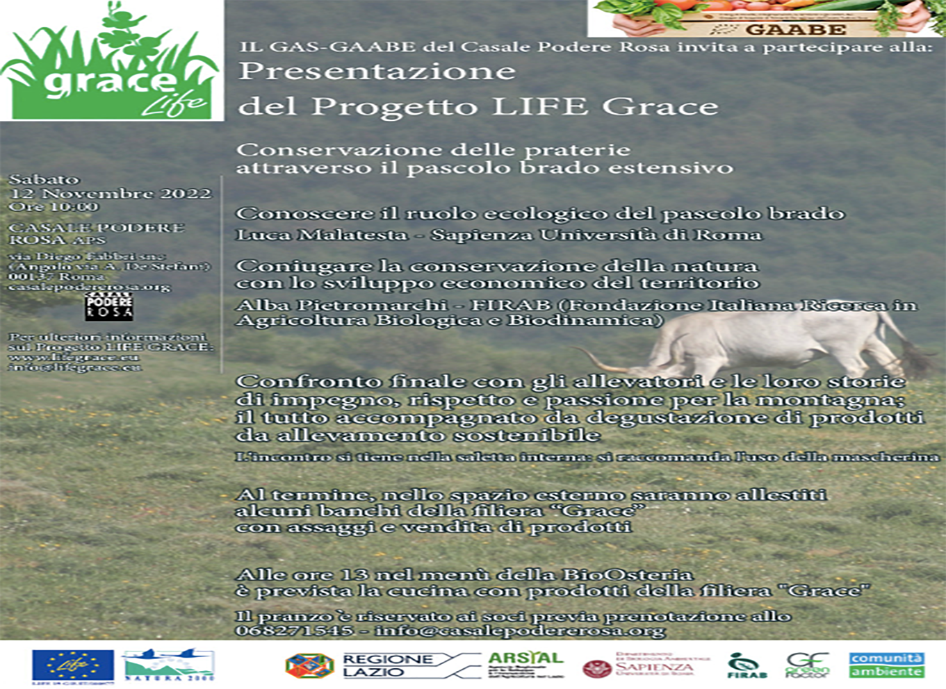 il 12 novembre 2022 a roma, al casale podere rosa, si terra’ la presentazione del progetto life grace, di cui e’ capofila arsial, l’agenzia regionale per lo sviluppo e l’innovazione dell’agricoltura del lazio, informa un comunicato. life grace ha la finalita’ di promuovere la conservazione degli habitat seminaturali della rete natura 2000 accomunati dalla necessita’ del pascolamento quale condizione per evitarne il logoramento o la perdita. per ottenere tale risultato il progetto prevede, fra le altre cose, il coinvolgimento diretto degli attori della filiera carne del territorio, al fine di valorizzarne i prodotti provenienti dalle aree natura 2000.
