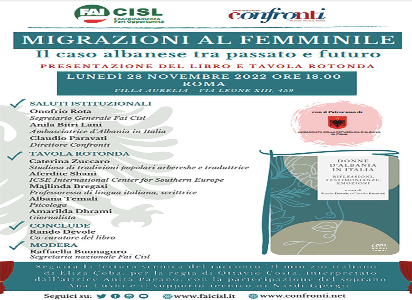 “si svolgera’ lunedi’ 28 novembre, in occasione della festa nazionale dell’albania, l’evento ‘migrazioni al femminile: il caso albanese tra passato e futuro’, organizzato dal sindacato agroalimentare fai-cisl e dal centro studi confronti. l’incontro sara’ aperto dagli interventi di onofrio ROTA, segretario generale della fai-cisl, anila bitri LANI, ambasciatrice d’albania in italia e claudio PARAVATI, direttore di confronti, e proseguira’ con la presentazione del libro ‘donne d’albania in italia: riflessioni, testimonianze, emozioni’, a cura di rando DEVOLE e claudio PARAVATI: con i curatori del volume interverranno caterina ZUCCARO, traduttrice e studiosa di tradizioni popolari arbereshe, aferdite SHANI di icse, international center for southern europe, la scrittrice majlinda BREGASI, la psicologa albana TEMALI e la giornalista amarilda DHRAMI”, rende noto un comunicato stampa di fai-cisl. “alla presentazione del libro, moderata dalla segretaria nazionale della fai-cisl raffaella BUONAGURO, seguira’ la lettura scenica del racconto ‘il mio zio italiano’ di eliza ÇOBA, per la regia di ottavio COSTA, interpretato dall’attrice anita PAGANO, con la partecipazione del soprano ana LUSHI e il supporto tecnico di nardi GJERGJI. l’evento, organizzato nell’ambito delle iniziative del coordinamento pari opportunita’ della fai-cisl, si terra’ presso l’auditorium di villa aurelia a roma, via leone XIII 459, dalle ore 18”, conclude fai-cisl.