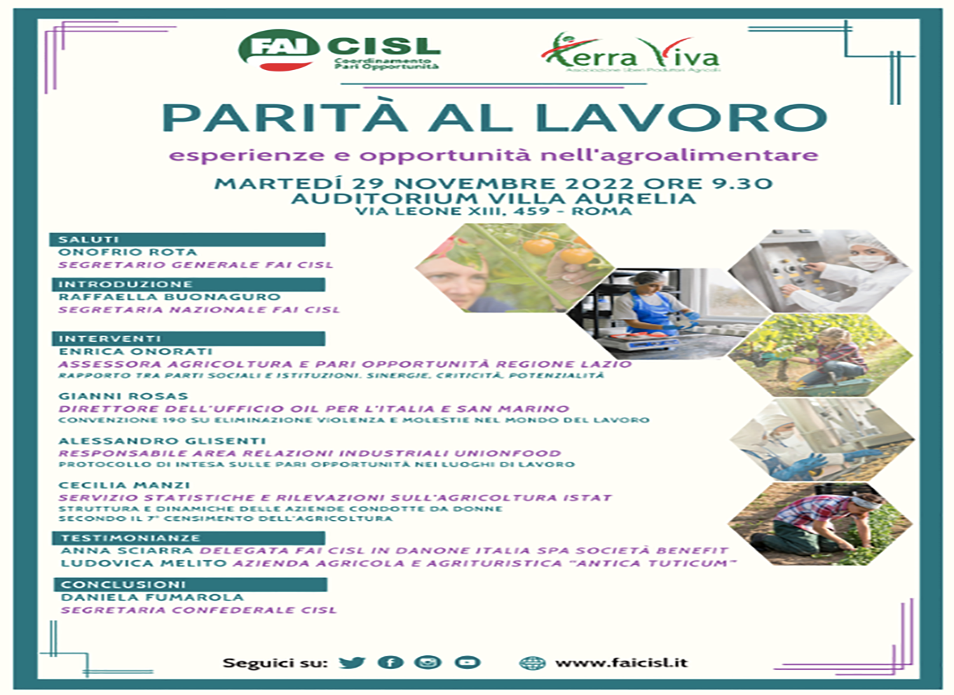 “in occasione della giornata internazionale per l’eliminazione della violenza contro le donne, che si celebra il 25 novembre, il coordinamento pari opportunita’ della fai cisl, federazione agroalimentare e ambientale della cisl, organizza un incontro tematico nell’auditorium di villa aurelia a roma. martedi’ 29 novembre, dalle ore 9,30, si svolgera’ ‘parita’ al lavoro – esperienze e opportunita’ nell’agroalimentare’, introdotto dal segretario generale fai cisl onofrio ROTA e da raffaella BUONAGURO, segretaria nazionale e responsabile del coordinamento pari opportunita’ della fai cisl, con gli interventi di enrica ONORATI, assessora all’agricoltura e alle pari opportunita’ della regione lazio, gianni ROSAS, direttore ufficio oil per l’italia e san marino, alessandro GLISENTI, responsabile area relazioni industriali per union food, cecilia MANZI, servizio statistiche e rilevazioni sull’agricoltura di istat. seguiranno le testimonianze di anna SCIARRA, delegata sindacale e ludovica MELITO, imprenditrice agricola. le conclusioni saranno affidate a daniela FUMAROLA, segretaria confederale cisl”, informa un comunicato della fai cisl. “il problema della violenza di genere e’ profondamente culturale, va affrontato rimodulando pensieri e linguaggi, ma anche intervenendo su tanti aspetti concreti, legati al mondo del lavoro, dell’economia, alle decisioni politiche e istituzionali”, ha detto ROTA. “l’italia rimane di 14 punti percentuali al di sotto della media europea rispetto al tasso di occupazione femminile, che e’ del 55,7%, mentre quello maschile si attesta al 75,8%. abbiamo inoltre 1 milione di donne che non trovano lavoro e 8 milioni che hanno smesso di cercarlo. la violenza a volte si manifesta con le discriminazioni nei luoghi di lavoro, come ad esempio il gender pay gap: in europa esiste un divario del 16% tra la retribuzione lorda oraria degli uomini e delle donne e l’italia, nel 2021, e’ scesa dal 70° al 76° posto mondiale nella classifica dei paesi che attuano la parita’ salariale”, ha affermato BUONAGURO. “queste e altre riflessioni legate ai temi della conciliazione tempi vita e lavoro, welfare aziendale, contrattazione e ruolo della bilateralita’, contrasto alla violenza e molestie nel mondo del lavoro, condizioni delle lavoratrici in agricoltura e nell’agroalimentare, saranno al centro del dibattito organizzato”, spiega ancora fai cisl. “dare risposte alle problematiche e alle aspettative delle donne e’ fondamentale per contribuire a raggiungere obiettivi di coesione sociale e di crescita, tratti distintivi per una societa’ moderna e sempre piu’ inclusiva”, ha concluso BUONAGURO.