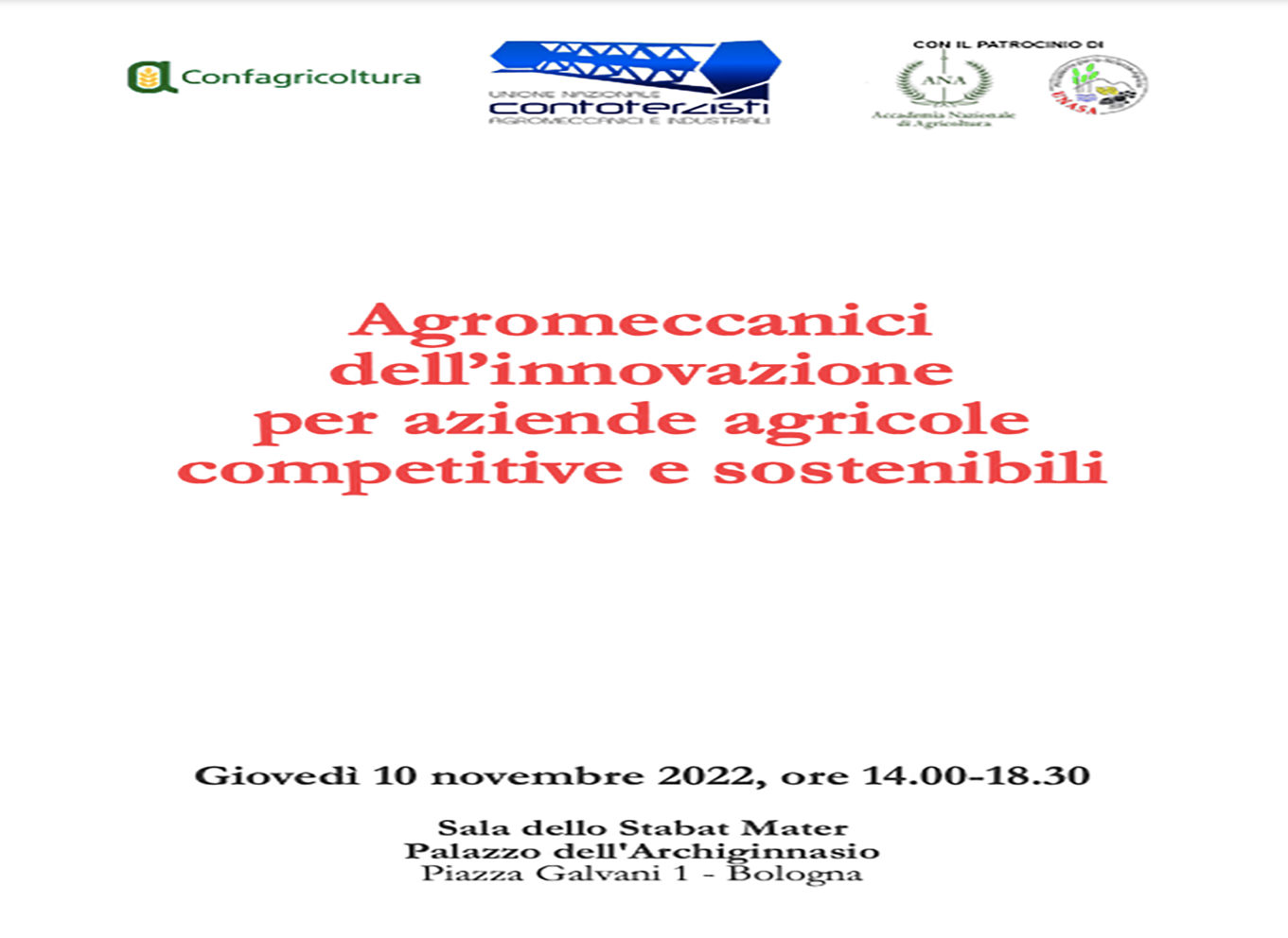 un comunicato stampa uncai rende noto che: “‘produttivita’ e transizione ecologica si realizzano attraverso l’innovazione’. nel corso dell’incontro si cerchera’ di motivare tale affermazione, spesso presa come assunto, e di mettere a tema ostacoli e opportunita’ delle nuove tecnologie digitali alle quali si chiede di restituire valore economico, ma non solo, all’agricoltura. il convegno provera’, cosi’, a dare una risposta all’invito, giunto da piu’ parti, a rimodellare gli strumenti organizzativi dei sistemi agricoli per favorire una svolta che coniughi competitivita’, societa’, lavoro e ambiente e metta in sicurezza le filiere agroalimentari dalle crisi globali. in tale modello i contoterzisti troveranno posto? il contoterzismo avra’ un futuro? se si’, sara’ uguale al presente oppure qualcosa dovra’ cambiare? e in che modo? il convegno, organizzato da uncai (unione nazionale contoterzisti agromeccanici e industriali) e confagricoltura con il patrocinio dell’accademia nazionale di agricoltura e unasa (l’unione delle accademie di scienze agrarie), si svolgera’ all’archiginnasio di bologna, nella storica sala detta dello stabat mater in memoria della prima esecuzione, tenutavi il 18 marzo 1842, dello ‘stabat mater’ di gioachino ROSSINI, sotto la direzione di gaetano DONIZETTI “. al convegno interverranno, tra gli altri: giorgio CANTELLI FORTI, presidente accademia nazionale di agricoltura; donato ROSSI, delegato di giunta di confagricoltura; angelo FRASCARELLI, presidente ismea; antonio PATUELLI, presidente abi; roberto SCOZZOLI, direttore tecnico uncai; giuliano OLDANI, consigliere uncai; enrica MAMMUCARI, segretaria nazionale uila-uil; tina BALI’, segretaria nazionale flai-cgil. chiuderanno i lavori: massimiliano GIANSANTI, presidente confagricoltura; aproniano TASSINARI, presidente uncai; giovanni MOLARI, magnifico rettore alma mater studiorum universita’ di bologna.