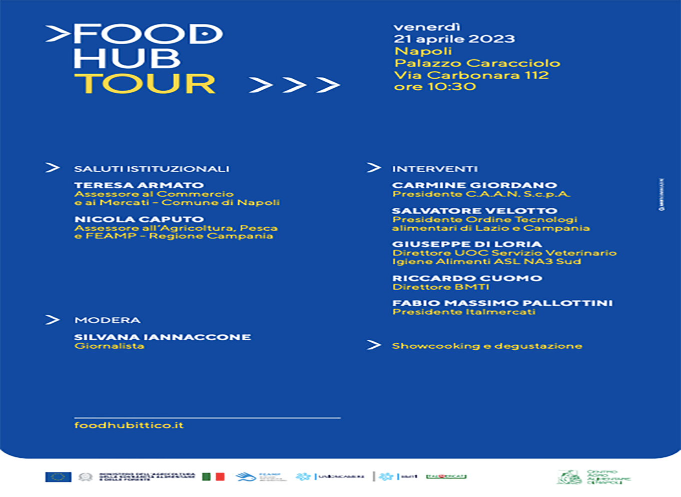 “venerdi’ 21 aprile, a partire dalle 10.30, a napoli, a palazzo caracciolo si svolgera’ la nuova tappa di food hub, l’iniziativa realizzata dal ministero dell’agricoltura, della sovranita’ alimentare e delle foreste e da unioncamere nell’ambito del po feamp 2014-2020, con la collaborazione tecnico-scientifica di bmti e italmercati, volta a far conoscere le specie ittiche e a rafforzare la filiera. interverranno: teresa ARMATO, assessore al commercio e ai mercati – comune di napoli; nicola CAPUTO, assessore all’agricoltura, pesca e feamp – regione campania; carmine GIORDANO presidente c.a.a.n. s.c.p.a.; salvatore VELOTTO, presidente ordine tecnologi alimentari di lazio e campania; giuseppe DI LORIA, direttore uoc servizio veterinario igiene alimenti asl na3 sud; riccardo CUOMO, direttore bmti; fabio massimo PALLOTTINI, presidente italmercati. insieme ad esperti del settore e ambasciatori della sostenibilita’, l’iniziativa intende consolidare la filiera ittica e far conoscere i prodotti ed i sistemi di pesca sostenibile, attraverso attivita’ di intrattenimento come show cooking, dibattiti ed altre attivita’ divulgative, con l’obiettivo di sensibilizzare i consumatori verso acquisti consapevoli. il programma del convegno al link: https://bit.ly/41a5yv5“, rende noto un comunicato stampa.