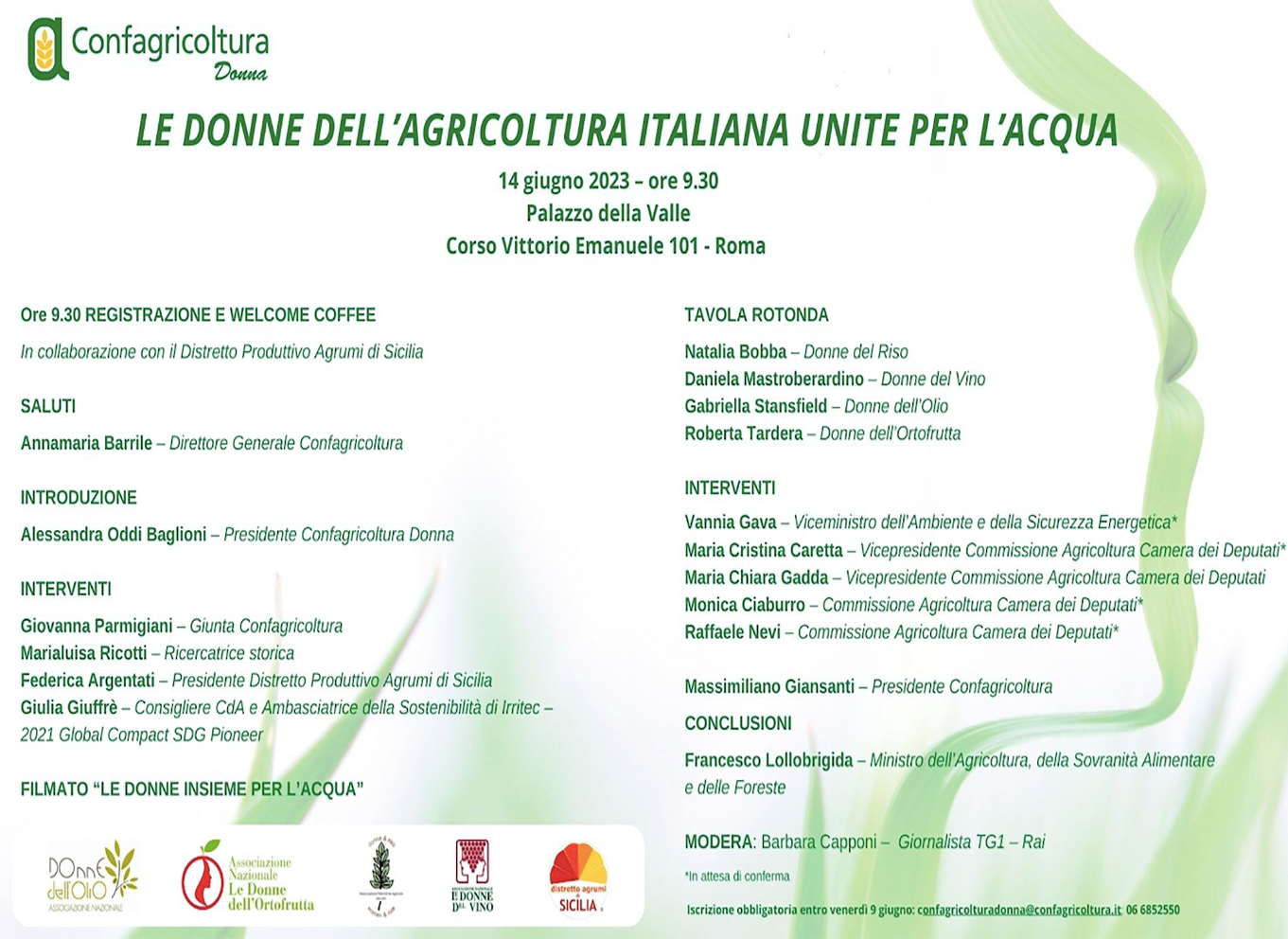 “siccita’, alluvioni, dissesto idrogeologiche mettono a forte rischio le produzioni agricole. quattro settori chiave si uniscono, al di la’ delle sigle, per esaminare che cosa fare. le donne del vino, dell’olio, dell’ortofrutta e del riso fanno quadrato partendo dalla naturale resilienza femminile, per avanzare proposte comuni alla politica, per affrontare i danni, spesso irreparabili, causati da siccita’ e alluvioni. l’appuntamento e’ per mercoledi’ 14 giugno a roma, ore 9.30 a palazzo della valle, con il convegno 1le donne dell’agricoltura italiana unite per l’acqua’”, informa un comunicato di confagricoltura. i lavori saranno aperti da annamaria BARRILE, direttrice generale confagricoltura, e alessandra ODDI BAGLIONI, presidente confagricoltura donna. tra gli interventi: giovanna PARMIGIANI, giunta confagricoltura; natalia BOBBA, donne del riso; daniela MASTROBERARDINO, donne del vino; gabriella STANSFIELD, donne dell’olio; roberta TARDERA, donne dell’ortofrutta. concluderanno i lavori il presidente di confagricoltura, massimiliano GIANSANTI, ed il ministro dell’agricoltura, francesco LOLLOBRIGIDA.