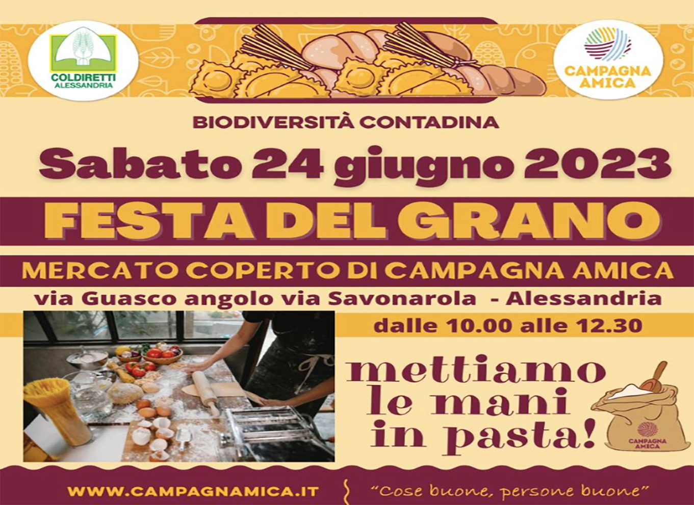in concomitanza con la tradizionale mietitura dei campi, al mercato coperto di campagna amica di alessandria, in via guasco, domani, sabato 24 giugno dalle 10 alle 12.30, si potranno conoscere da vicino i cereali locali attraverso degustazioni e dimostrazioni. protagonisti della festa a tema dedicata a “il grano: dalla mietitura al pane, pasta e pizza” – spiega coldiretti provinciale – saranno i prodotti realizzati con farina made in alessandria e grano 100% san pastore, il pregiato cereale antico, sigillo di campagna amica.