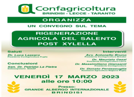PUGLIA: CONFAGRICOLTURA, IL 17/3 A BRINDISI CONVEGNO RIGENERAZIONE AGRICOLA DEL SALENTO POST XYLELLA 15 Marzo, 2023 - (riproduzione riservata) "rigenerazione agricola del salento post xylella e' il tema del convegno che si terra' venerdi' prossimo, 17 marzo 2023 a brindisi nel grande albergo internazionale (viale regina margherita, 23). all'incontro prenderanno parte il sottosegretario al masaf patrizio LA…