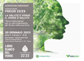 IL 20/01 PRESENTAZIONE FOCUS 22/23 DEL LIBRO BIANCO DEL VERDE DI CONFAGRICOLTURA E ASSOVERDE 17 Gennaio, 2023 - (riproduzione riservata) il prossimo 20 gennaio (ore 9:30-18:00), a roma, a palazzo della valle (sede di confagricoltura), corso vittorio emanuele II 101, e in modalita' webinar, confagricoltura e assoverde presentano il nuovo focus 22/23 del libro bianco del verde - la salute… [addtoany buttons=”facebook,twitter,email”]