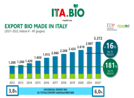 BIOLOGICO: ITA.BIO, IN 2022 EXPORT A 3,4 MLD +16% SU 2021 IL 19% SPETTA AL VINO (+18%) 8 Settembre, 2022 - (riproduzione riservata) "molto positiva la performance dell'export bio: nel 2022 le vendite di prodotti agroalimentari italiani bio sui mercati internazionali hanno raggiunto i 3,4 miliardi di euro, mettendo a segno una crescita del +16% (anno terminante giugno) rispetto all'anno precedente.… [addtoany buttons=”facebook,twitter,email”]