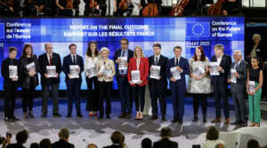 GIORNATA EUROPA: CERIMONIA DI CONSEGNA RELAZIONE FINALE FUTURO UE A METSOLA, MACRON E VON DER LEYEN 9 Maggio, 2022 - (riproduzione riservata) oggi, in una cerimonia di chiusura, la presidente del parlamento europeo roberta METSOLA, il presidente emmanuel MACRON a nome della presidenza del consiglio, e la presidente della commissione europea ursula VON DER LEYEN hanno ricevuto la relazione sui…