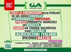 CIA, IL 20/03 A SCANZANO JONICO (MT) IN PIAZZA PER PSA, CARO ENERGIA/MATERIE PRIME E FAUNA SELVATICA 16 Marzo, 2022 - (riproduzione riservata) "prosegue la mobilitazione di cia-agricoltori italiani", rende noto un comunicato della confederazione, nel precisare che "dopo l'appuntamento al nord di rossiglione di fine febbraio scorso, sara' il sud di scanzano jonico, in provincia di matera, luogo di una…