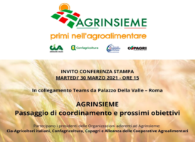 AGRINSIEME: MARTEDI’ 30 MARZO CONFERENZA STAMPA SU “PASSAGGIO DI COORDINAMENTO E PROSSIMI OBIETTIVI” 26 Marzo, 2021 - (riproduzione riservata) "martedi' 30 marzo 2021, alle ore 15:00, si terra' in collegamento teams da palazzo della valle a roma la conferenza stampa di agrinsieme su 'passaggio di coordinamento e prossimi obiettivi'. partecipano i presidenti delle organizzazioni aderenti ad agrinsieme:…