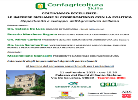 SICILIA: CONFAGRICOLTURA, 21/9 A TAORMINA (ME) TAVOLA ROTONDA TRA IMPRESE E POLITICA CON GIANSANTI 15 Settembre, 2023 - (riproduzione riservata) una tavola rotonda con i protagonisti dell'imprenditoria agricola siciliana e i rappresentanti delle istituzioni per ragionare insieme sulle leve strategiche per lo sviluppo del settore primario siciliano: questa l'iniziativa organizzata da confagricoltura sicilia per il 21 settembre al…